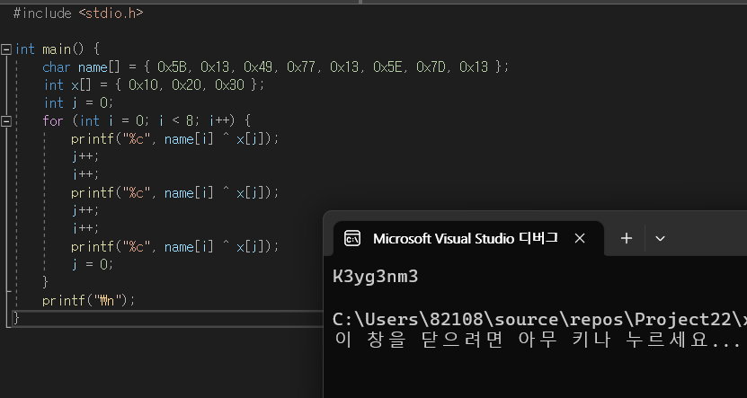 serial 생성 과정은 입력 받은 문자열을 가져와서 하나씩 0x10, 0x20, 0x30과 차례로 xor 연산을 해주는 것이다.