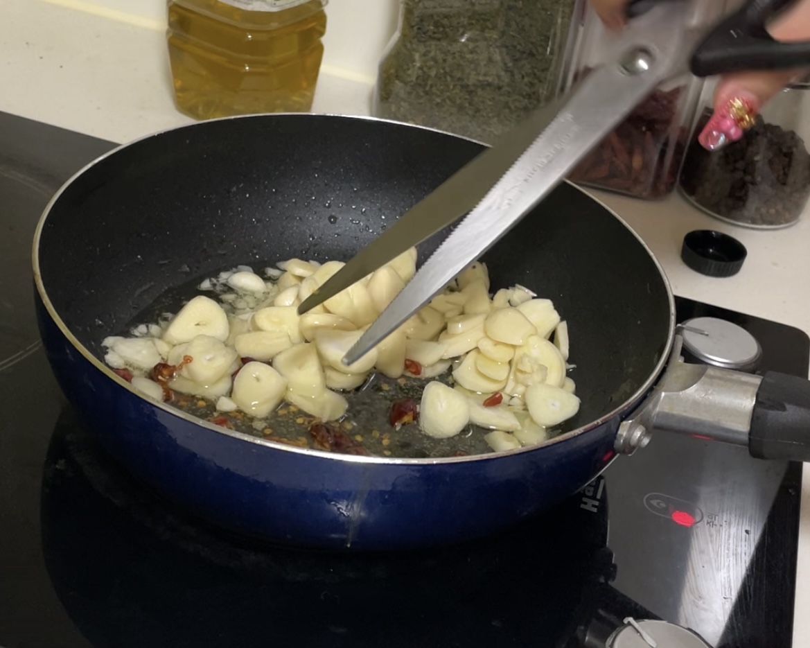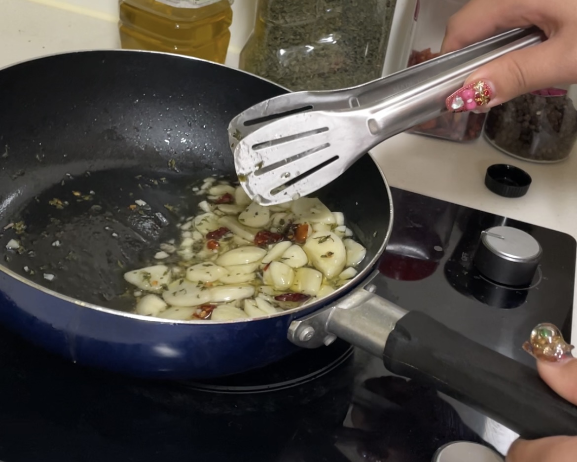 4. 마늘, 페페론치노, 파슬리, 후추 약간을 넣고 마늘을 튀기듯 익힌다.