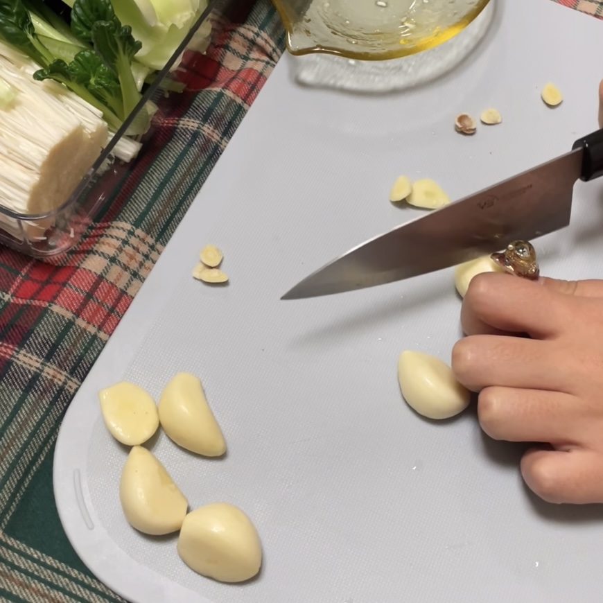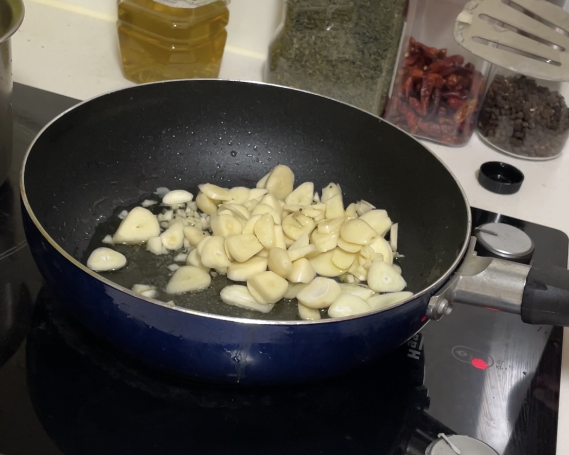 3. 프라이팬에 올리브유를 마늘이 잠길 만큼만 붓고 뜨거워질 때까지 기다린다.