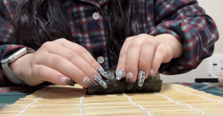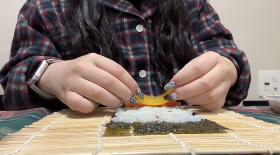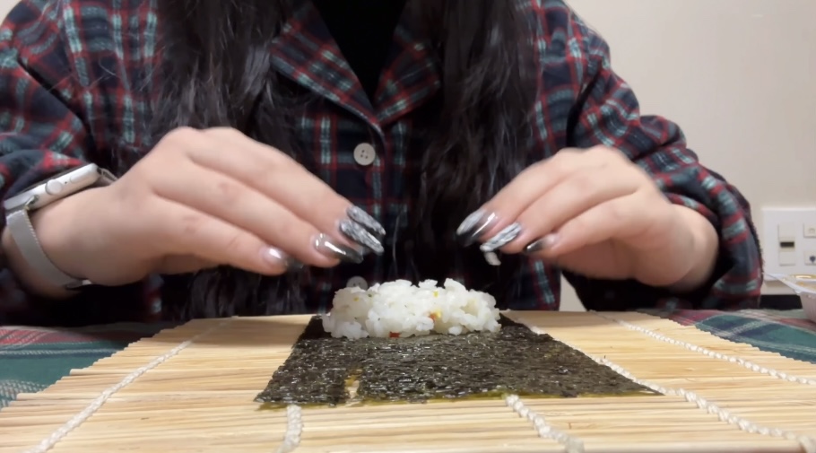 4. 재료가 다 준비되면 김 위에 밥, 재료를 순서대로 넣어 예쁘게 만다.