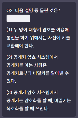 (1) 두 명이 대칭키 암호를 이용해 통신을 하기 위해서는 사전에 키를 교환해야 한다.