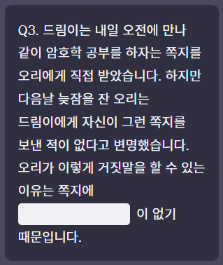 Q3. 드림이는 내일 오전에 만나 같이 암호학 공부를 하자는 쪽지를 오리에게 직접 받았습니다. 하지만 다음날 늦잠을 잔 오리는 드림이에게 자신이 그런 쪽지를 보낸 적이 없다고 변명했습니다. 오리가 이렇게 거짓말을 할 수 있는 이유는 쪽지에 부인 방지 기능이 없기 때문입니다.