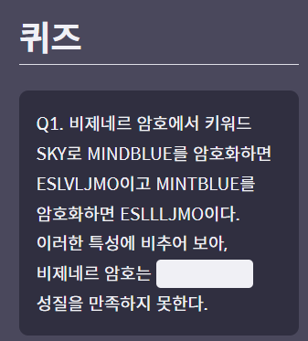 Q1. 비제네르 암호에서 키워드 SKY로 MINDBLUE를 암호화하면 ESLVLJMO이고 MINTBLUE를 암호화하면 ESLLLJMO이다. 이러한 특성에 비추어 보아, 비제네르 암호는 확산 성질을 만족하지 못한다.