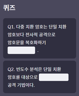 Q1. 다중 치환 암호는 단일 치환 암호보다 전사적 공격으로 암호문을 복호화하기 어렵다.