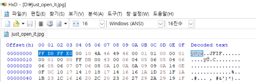 jpg의 헤더 시그니처 FF D8 FF E0 확인