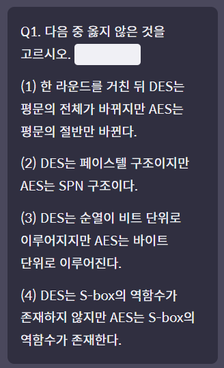 (4) DES는 S-box의 역함수가 존재하지 않지만 AES는 S-box의 역함수가 존재한다.