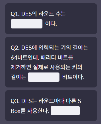 Q2. DES에 입력되는 키의 길이는 64비트인데, 패리티 비트를 제거하면 실제로 사용되는 키의 길이는 56비트이다.