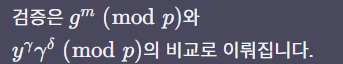 - γ' 계산 후 서명값의 γ 값과 비교 (두 값이 같으면 s는 유효한 서명)